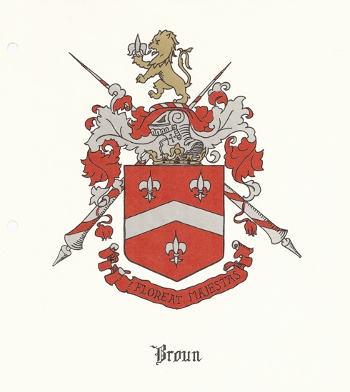 The family mottto, “Floreat Majestas”, means “Let Majesty Flourish”. The above coat of arms is similar to the one which the family had in France. The helmet and lances were added to the Broun Coat of Arms after the emigration to Scotland as a result of gallant services rendered by Sir Patrick Broun, who was the first member of the Broun family to be raised to the English peerage in 1686.